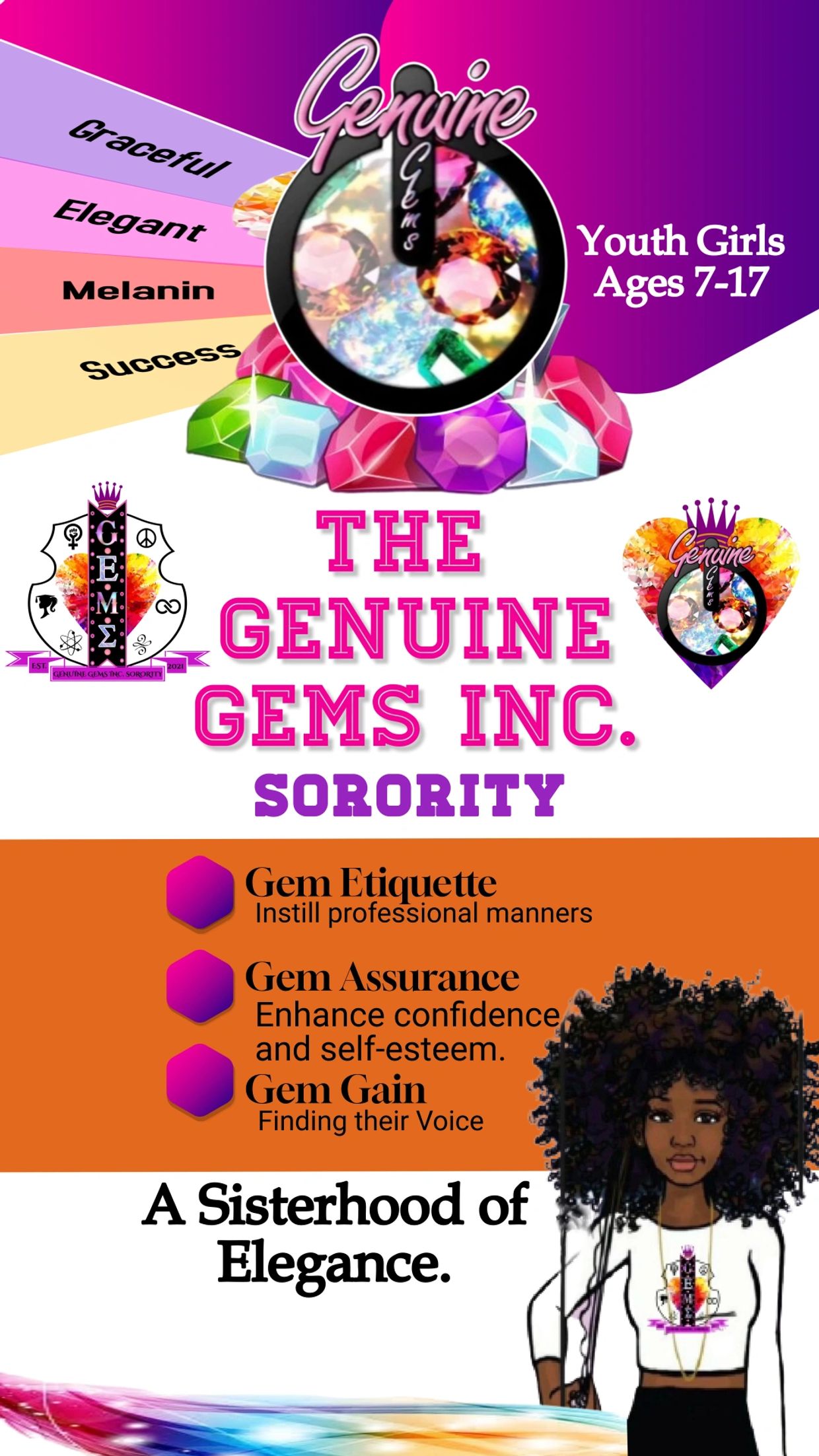 The Genuine Gems Stands For Girls Empowering. Mentoring Sorority. Genuine Gems Is A Sisterhood of Elegance. The Genuine Gems was designed to help young girls become positive role models for generations. The sorority prepares girls for the hardship of transitioning from adolescent to young women. By empowering young girls and teaching them proper etiquette, we're breaking the stigma of what beauty is expected to be. The Genuine Gems Inc. aims to create leaders, instill morals, and enhance character. We become graceful human beings, from little girls to young women. The Genuine Gems create everlasting bonds with one another while they broaden their creative minds. We grow with the mindset and intellect to inspire other girls to be great while leaving jewels of wisdom for the next Gem to follow!